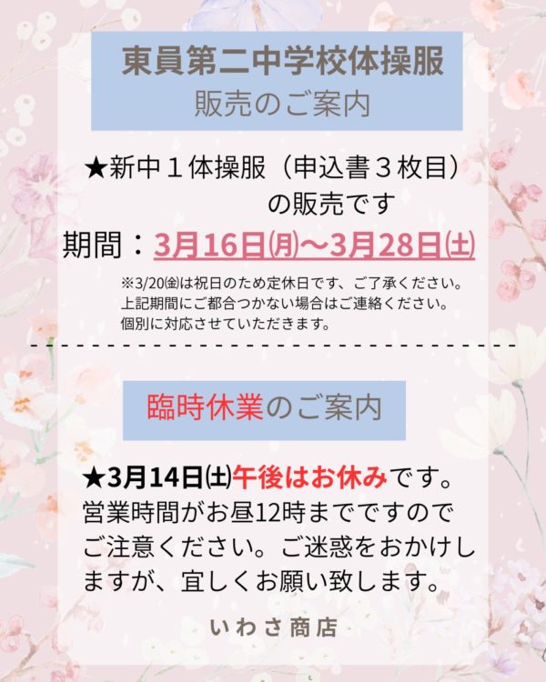 新中1ママさん、体操服が始まります!3月16日~3月28日